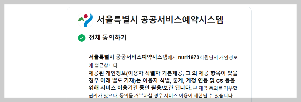 2. 서울시 공공서비스 예약시스템 약관에 동의하기를 체크합니다.