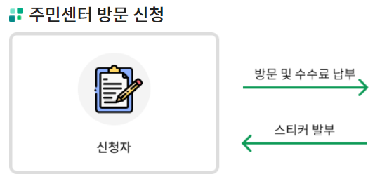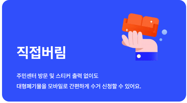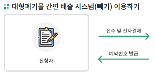 대형폐기물 수거신청은 거주지역 주민센터에 직접 방문 신고서에 의거 배출 신고 및 수수료 납부한후 신청자는 대형폐기물 스티커 부착하여 지정된 장소에 배출할 수 있으며 (신청자 방문 및 수수료납부->관할 주민센터 스티커발부->신청자 또는 작업공지->수거 작업자) 주민센터 방문 및 스티커 출력 없이도 대형폐기물 스티커 인터넷발급 또는 모바일로 대형폐기물을 간편하게 수거 신청 할 수 있습니다.